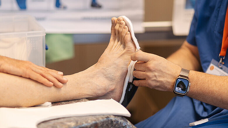 Ansonsten war die Tagung sehr gut besucht. Wir hatten über 300 Teilnehmende vor Ort und 70 bis 80 im Online-Stream. Auch die Workshops waren alle gut besucht. Es waren praxisorientierte Workshops, in denen Neueinsteiger z. B. lernen konnten, wie man einen Gips anlegt oder an das Filzen zur Druckentlastung herangeführt wurden. Diejenigen, die schon ein bisschen länger dabei sind, konnten an einem Dummy üben, zu Tenotomieren, also die Beugesehne zu durchtrennen.