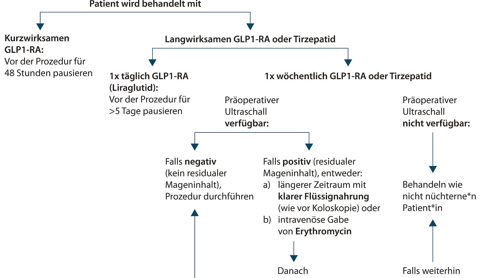 Ein 2024 veröffentlichtes Konsenspapier der Deutschen Gesellschaft für Anästhesiologie und Intensivmedizin (DGAI), der Deutschen Gesellschaft für Chirurgie (DGCH) und der Deutschen Gesellschaft für Innere Medizin (DGIM) hat erstmals Empfehlungen zur präoperativen Evaluation von Patient*innen vor elektiven Eingriffen formuliert. Hierzu zählt auch der perioperative Umgang mit Antidiabetika. Das Konsenspapier sieht u. a. vor, einmal wöchentlich applizierte GLP1-RA mindestens sieben Tage vor einer geplanten Operation abzusetzen. Begründet wird dies mit einem potenziellen Risiko für die Regurgitation von Mageninhalt und die pulmonale Aspiration infolge einer verzögerten Magenentleerung, wie sie im Zusammenhang mit der Einnahme von GLP1-RA häufig auftritt.