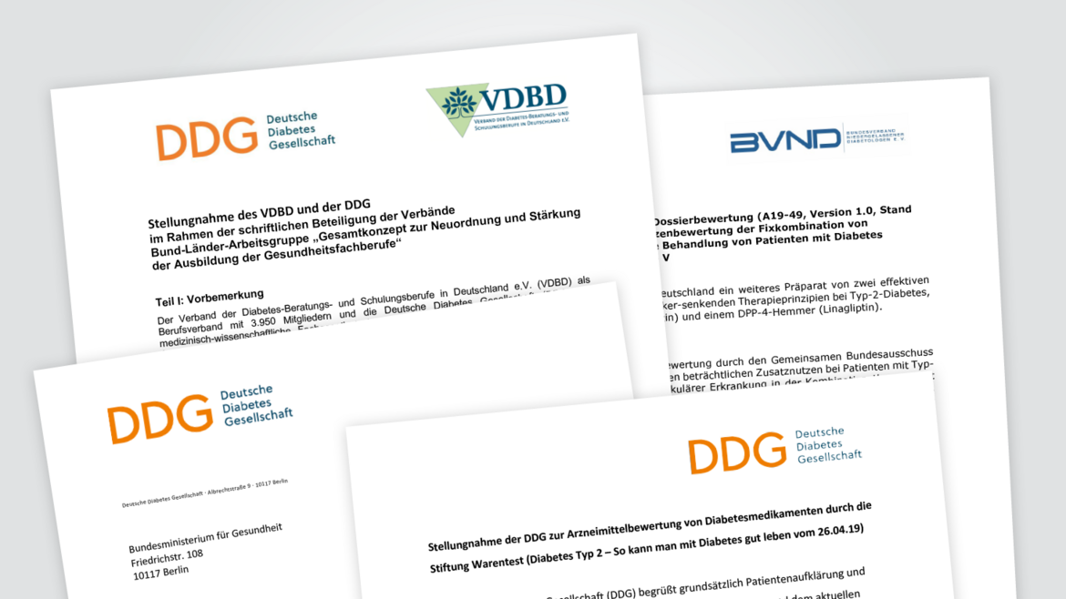 Die Deutsche Diabetes Gesellschaft bringt sich aktiv in die gesundheitspolitische Diskussion ein, um die Themen der Diabetologie zu stärken. Die Fachgesellschaft pflegt ein enges Netzwerk zu Entscheidern aus der Selbstverwaltung, der Gesundheitswirtschaft sowie der medizinischen Fachwelt. Außerdem reagiert die DDG auf wichtige gesundheits- und wissenschaftspolitische Bekanntmachungen und nimmt aktiv teil an zahlreichen Stellungnahmeverfahren zur Nutzenbewertung nach §35a SGBV (Arzneimittelbewertung) und zu Verfahren nach §137h SGBV (Untersuchungs- und Behandlungsmethoden mit Medizinprodukten hoher Risikoklasse).
